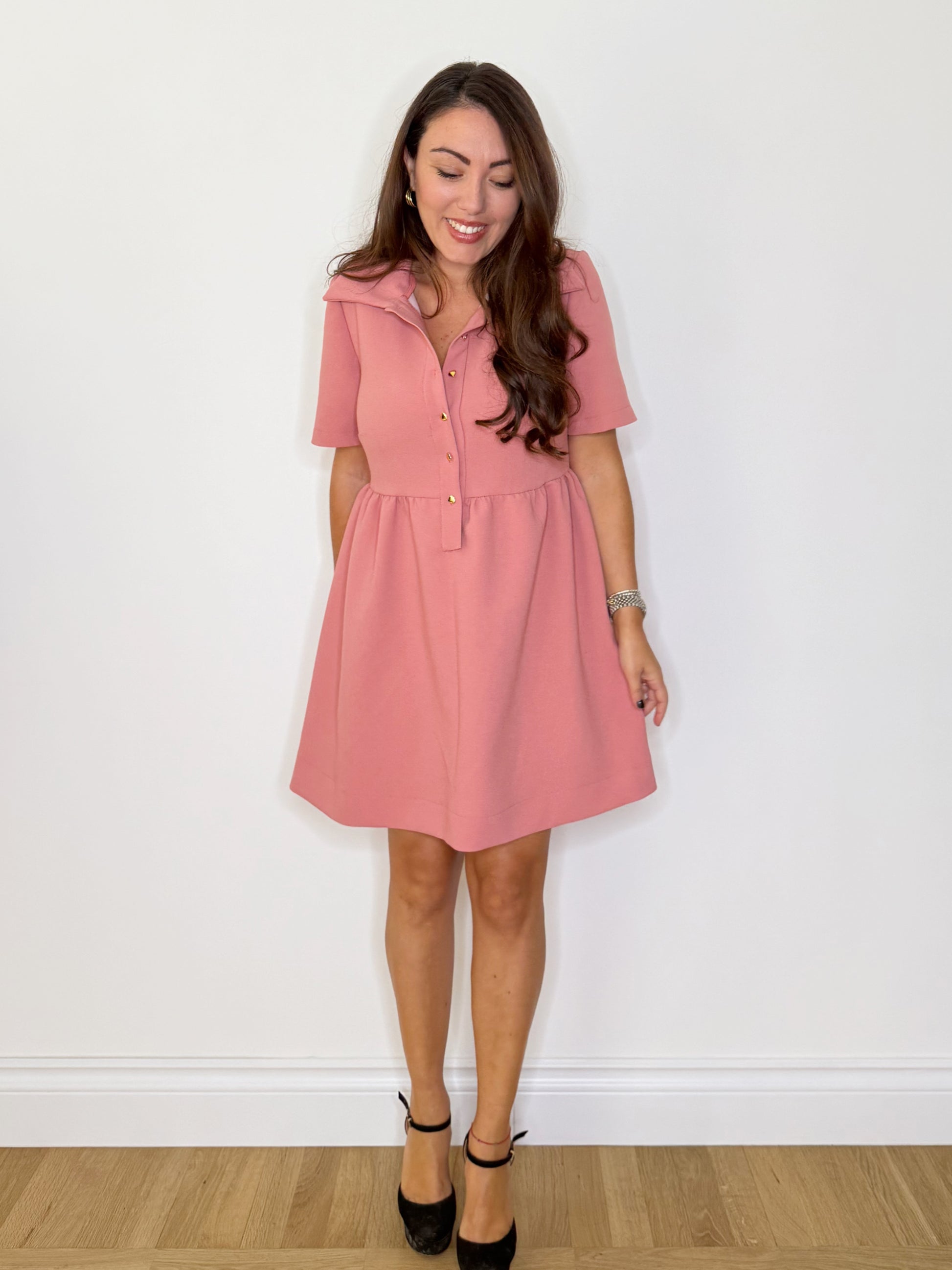 Il modello è confortevole grazie all’abbottonatura sul centro davanti, alla vita morbida e alle arricciature sulla balza.