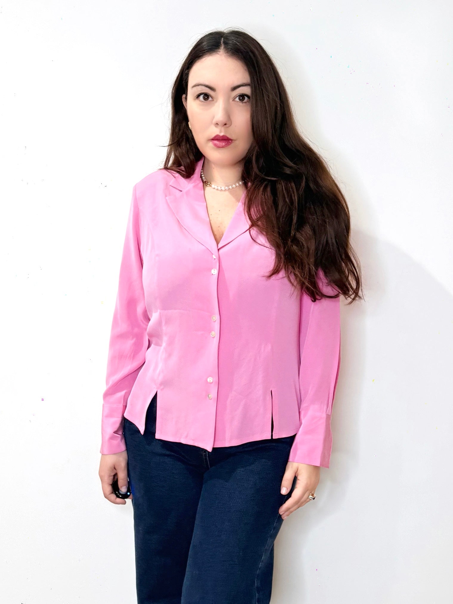 Elegante e raffinata camicia vintage realizzata in pura seta color rosa barbie. Brand: Cherie. Un capo Cherie è perfetto per chi ama: