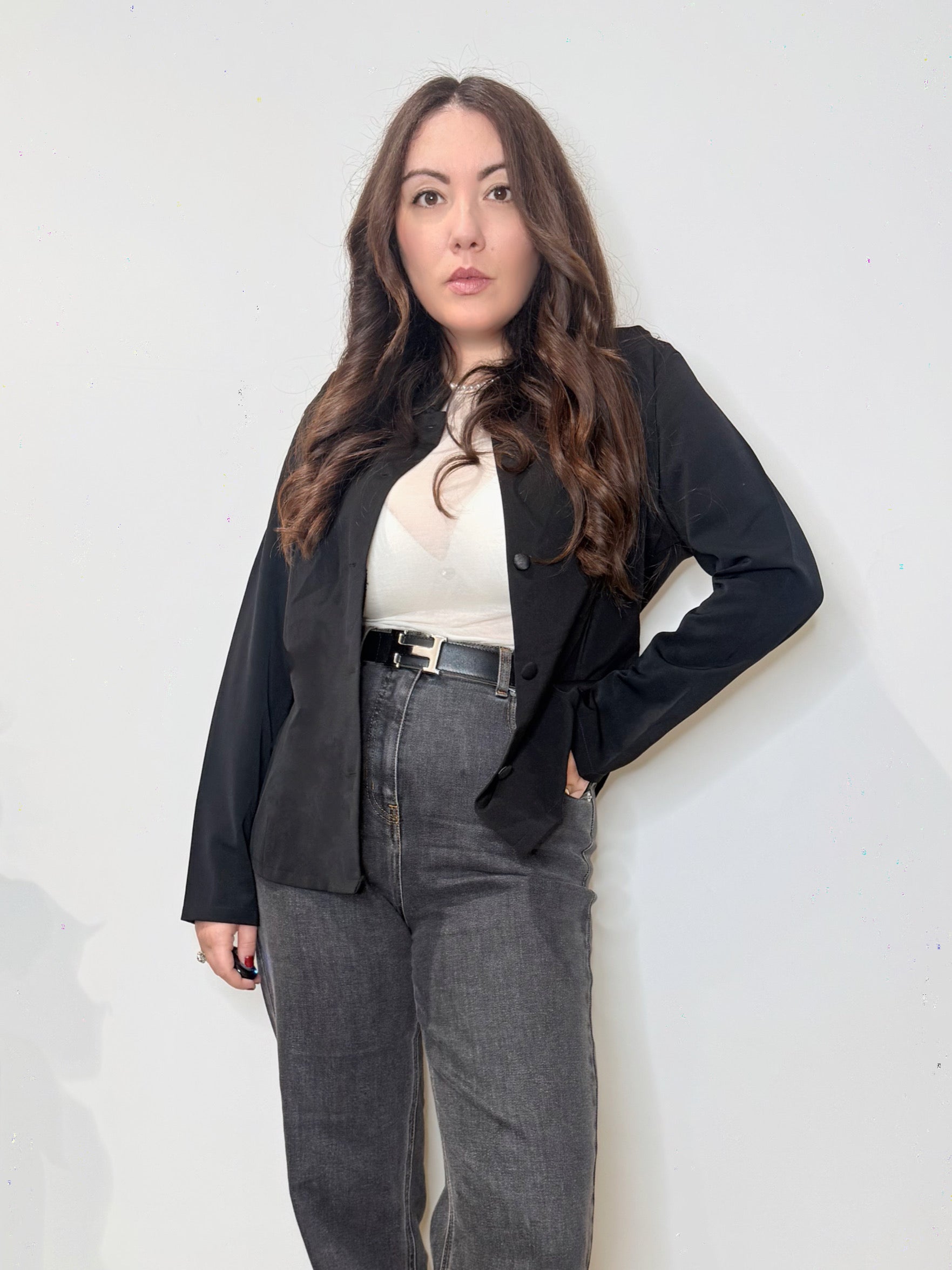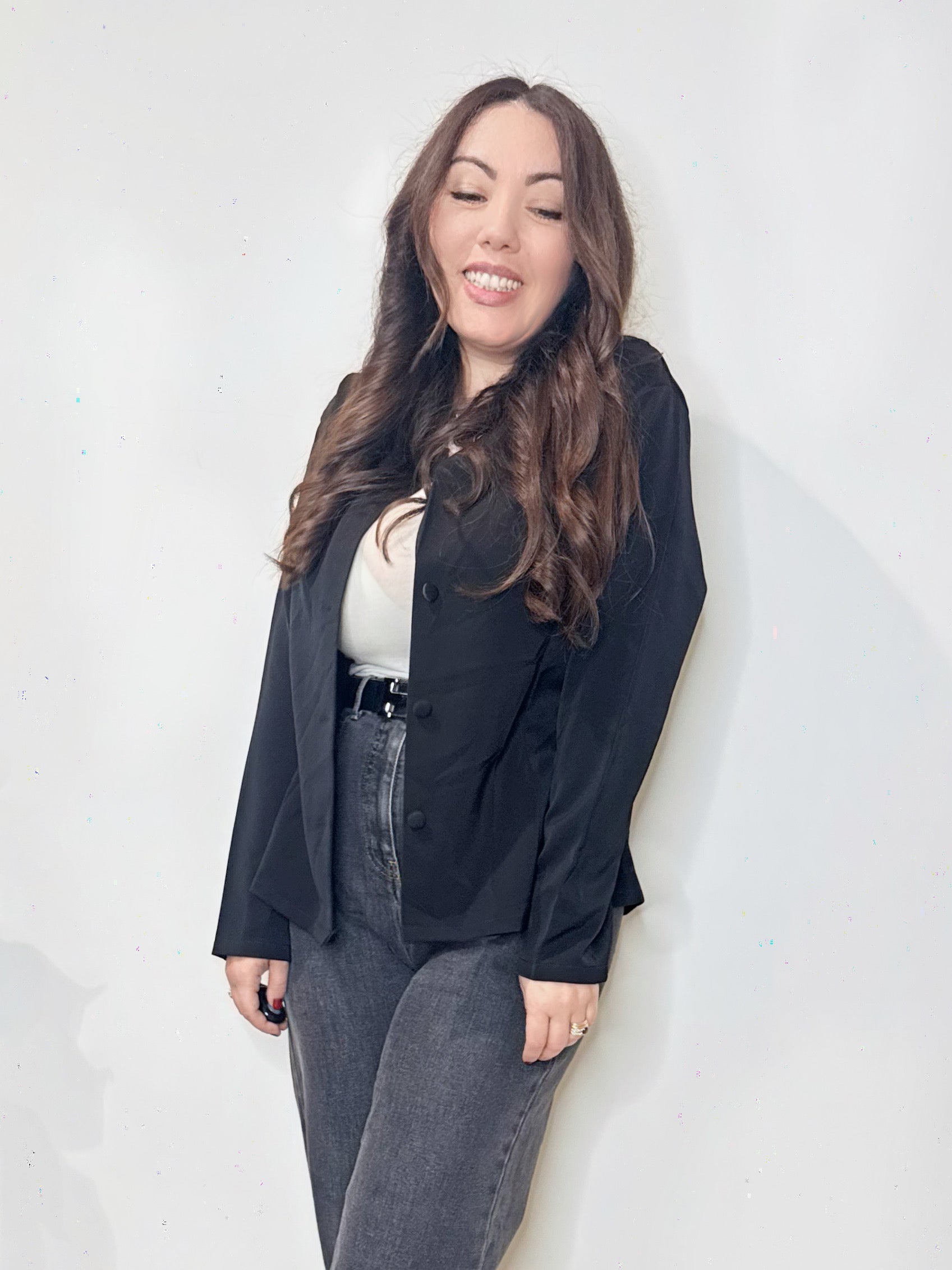 Essenziale camicia nera con collo alla coreana e bottoni foderati.