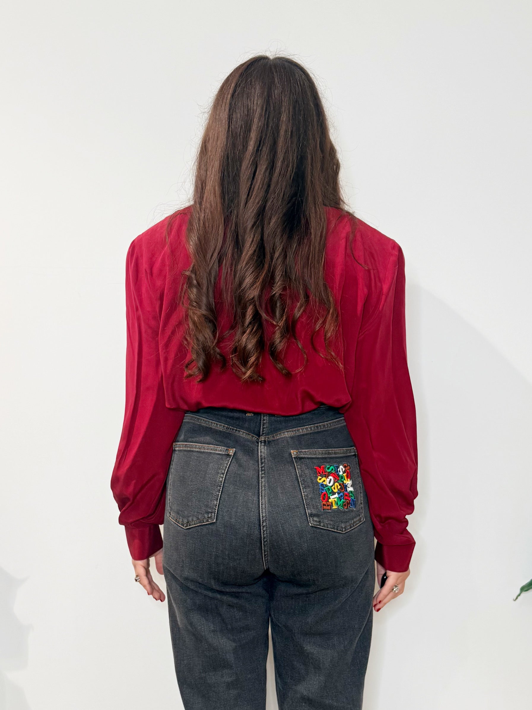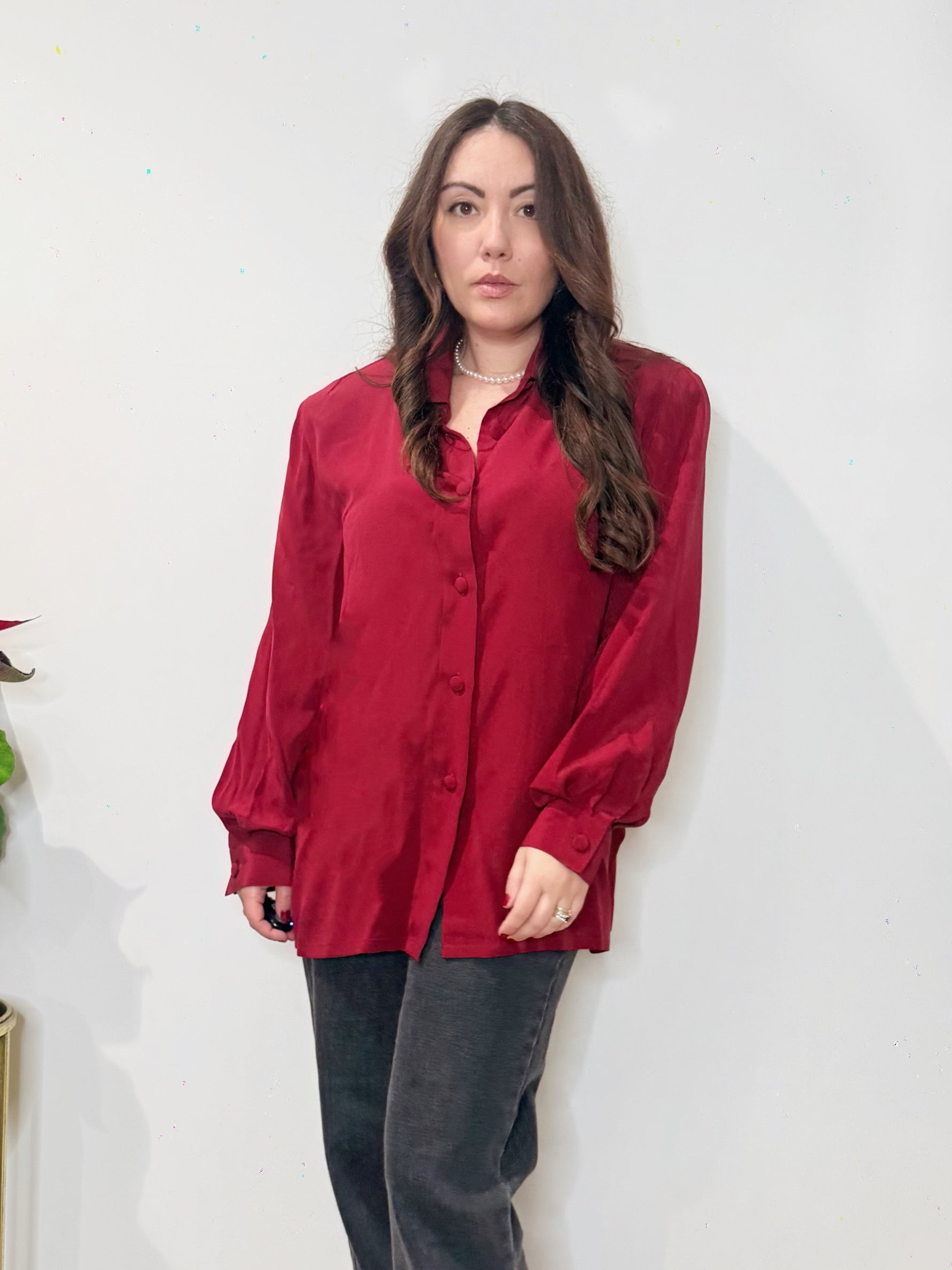 Seta color bordeaux. Abbottonatura centrale e maniche con polsini. Questa camicia non è mai stata indossata!