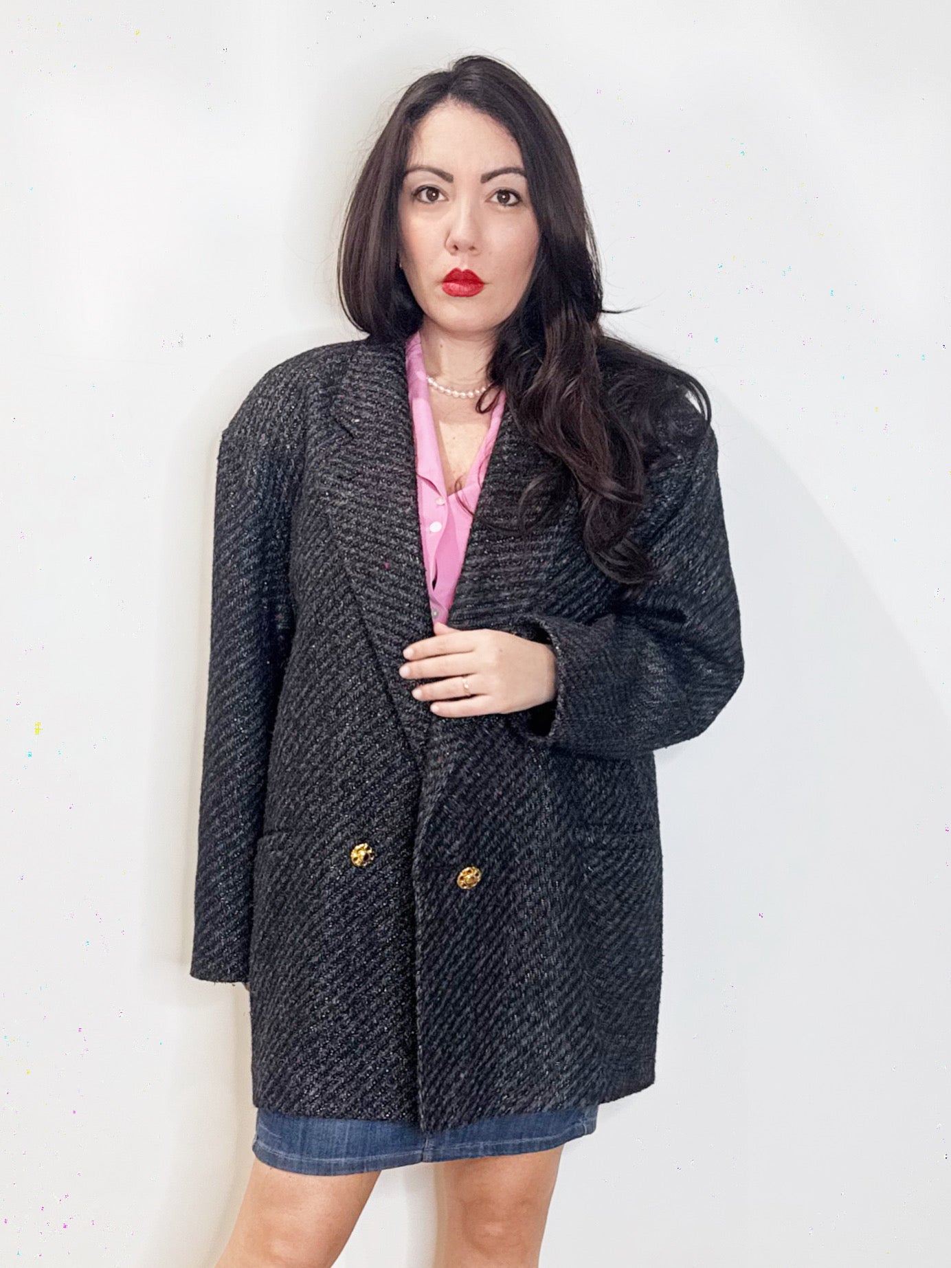 È un cappottino anni ’80 che racchiude tutta l’audacia gentile di quel decennio. Il taglio è doppiopetto, con una linea pulita e ben costruita che scivola sul corpo senza appesantirlo. La struttura c’è, ma non è rigida: accompagna la figura con naturalezza, lasciando che sia il movimento a raccontarne la personalità.