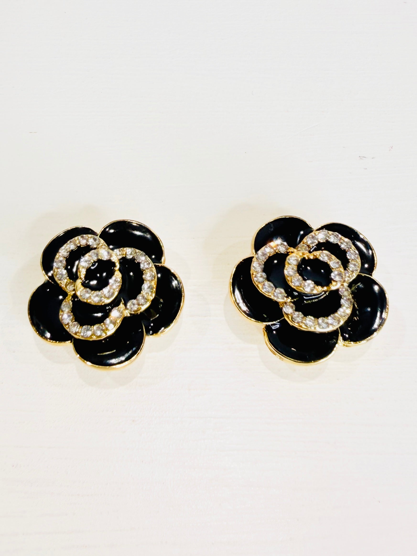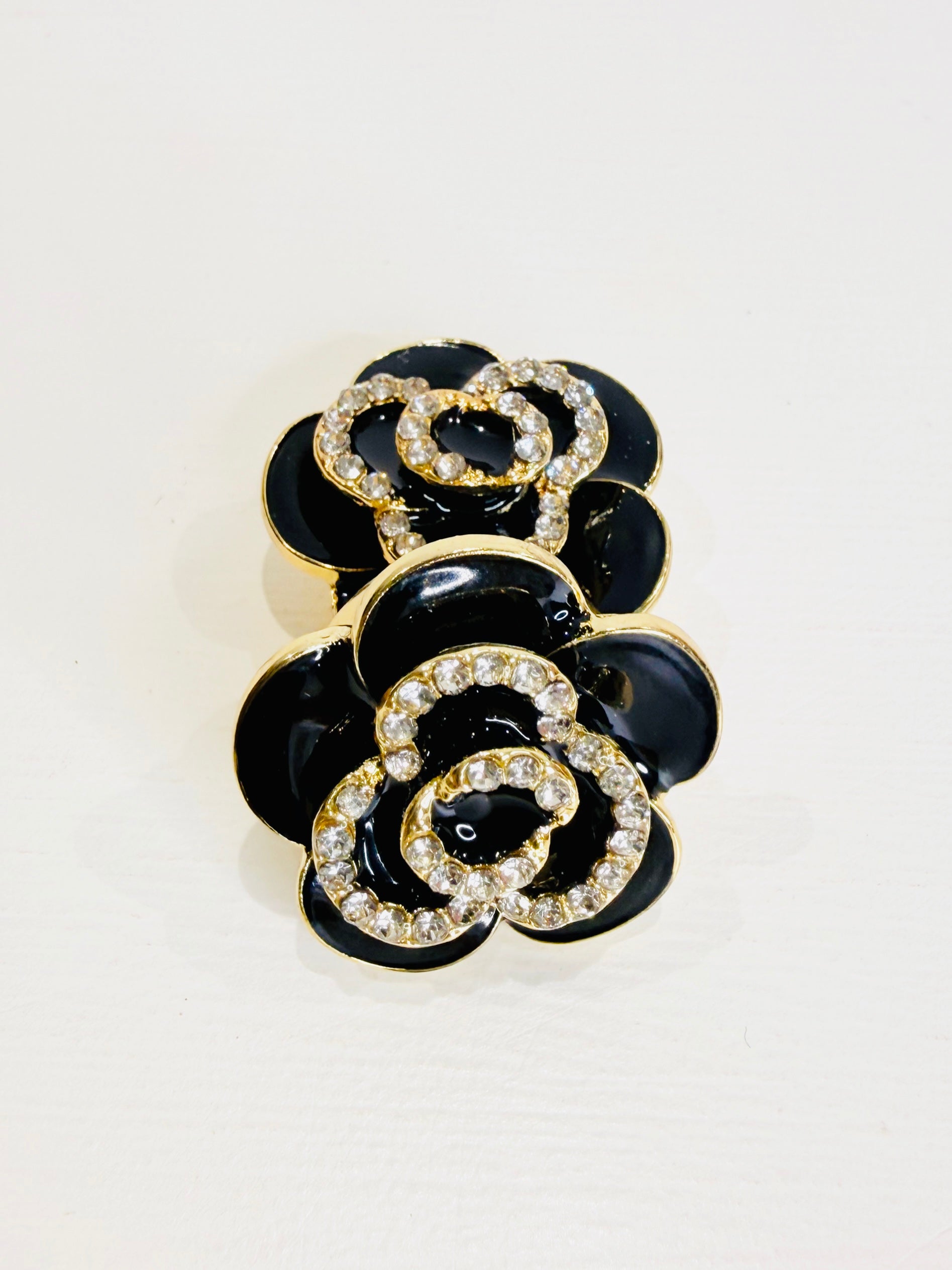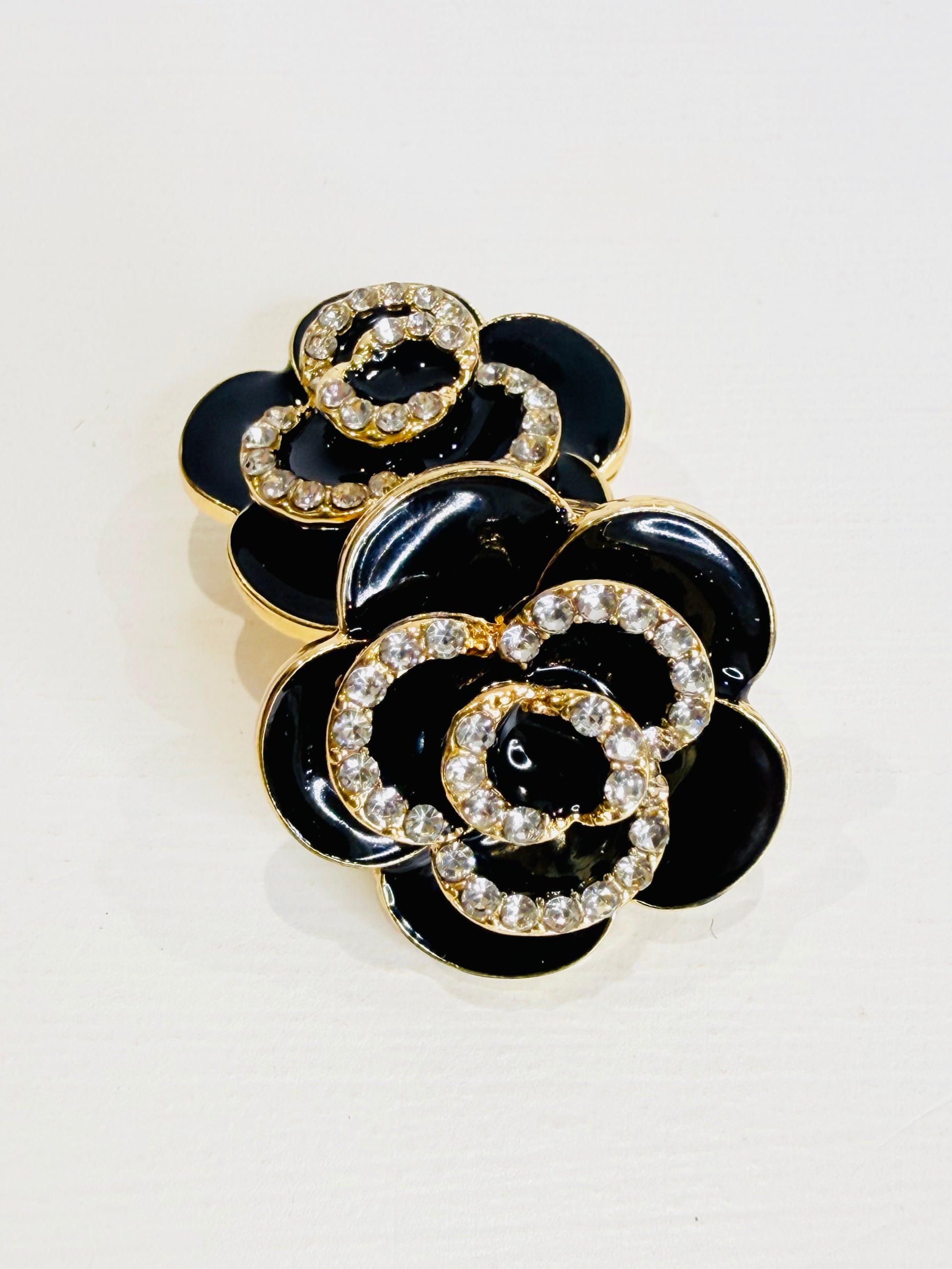 Eleganti copri bottoni a forma di camelia realizzati in acciaio e smalto.