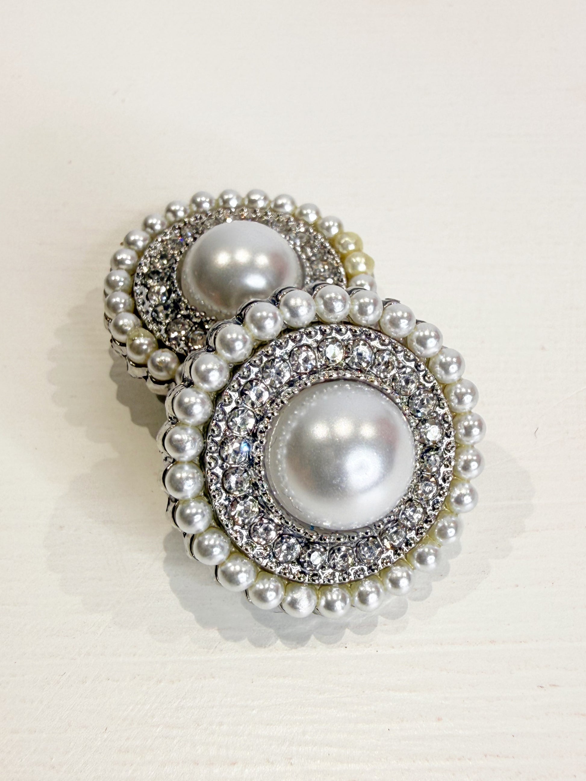 Eleganti copri bottoni realizzati in acciaio silver e decorati con perle e strass.