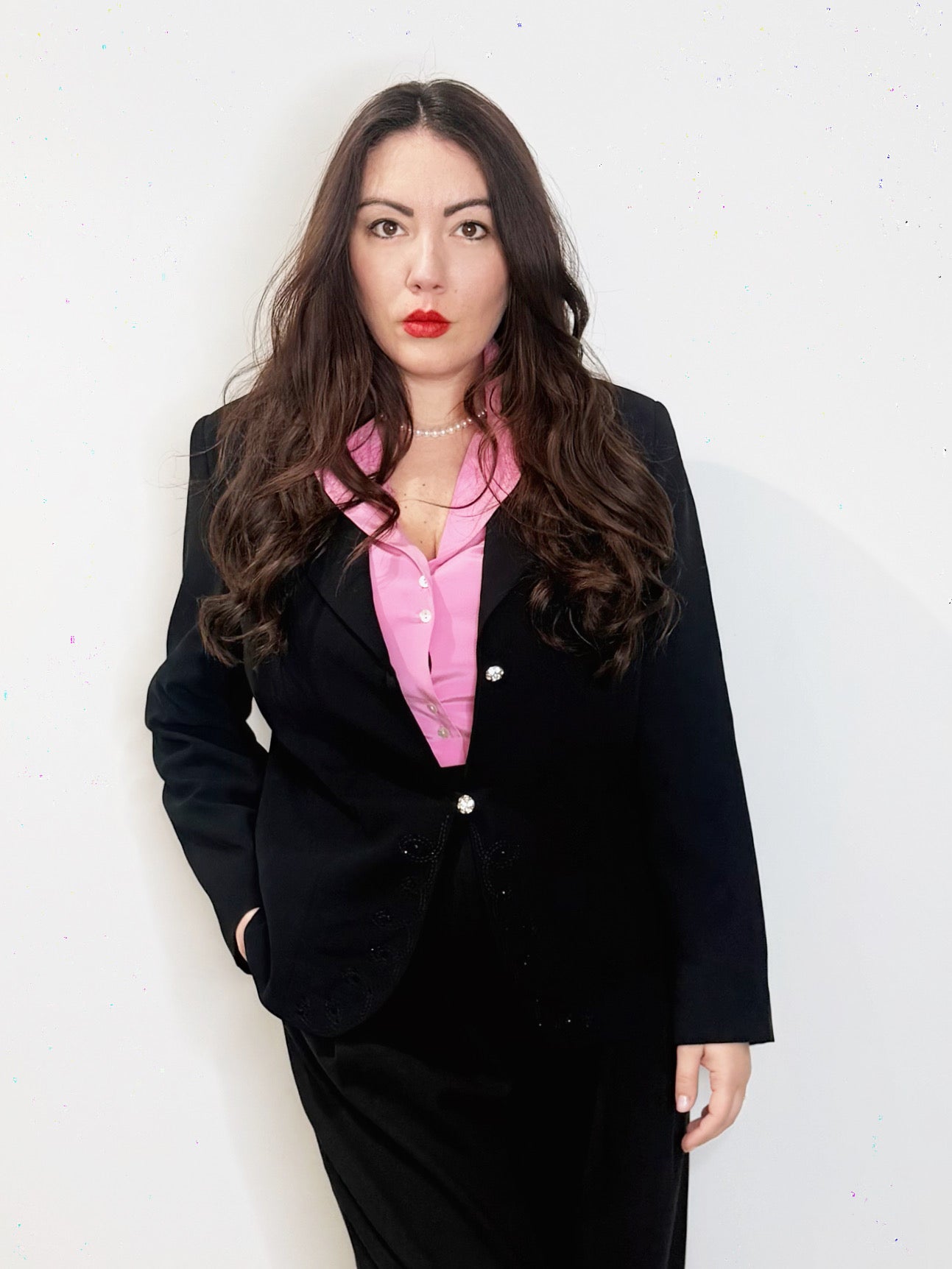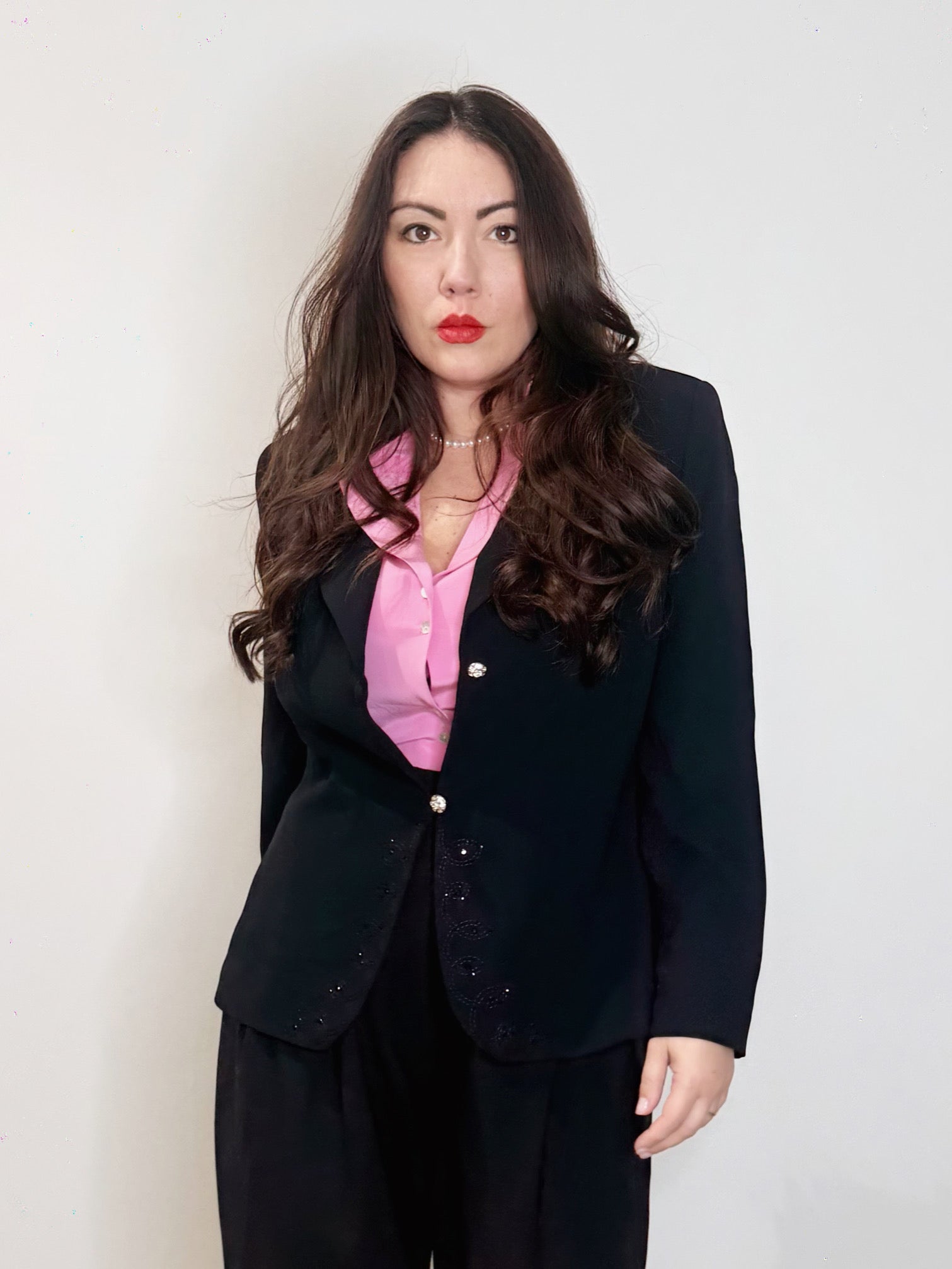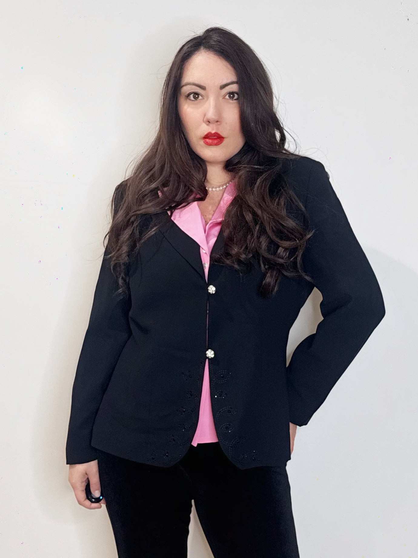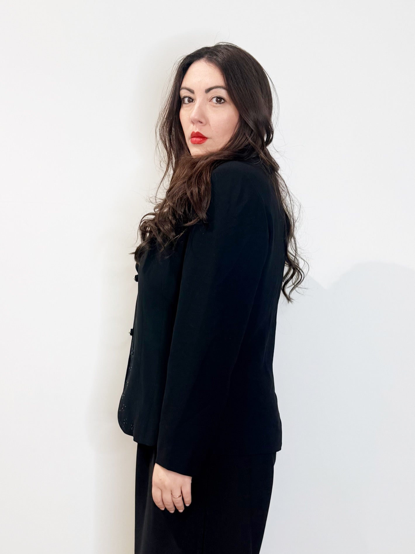 Elegantissima giacca vintage realizzata in viscosa nera con bottoni gioiello e ricamo sui bordi nel centro davanti.