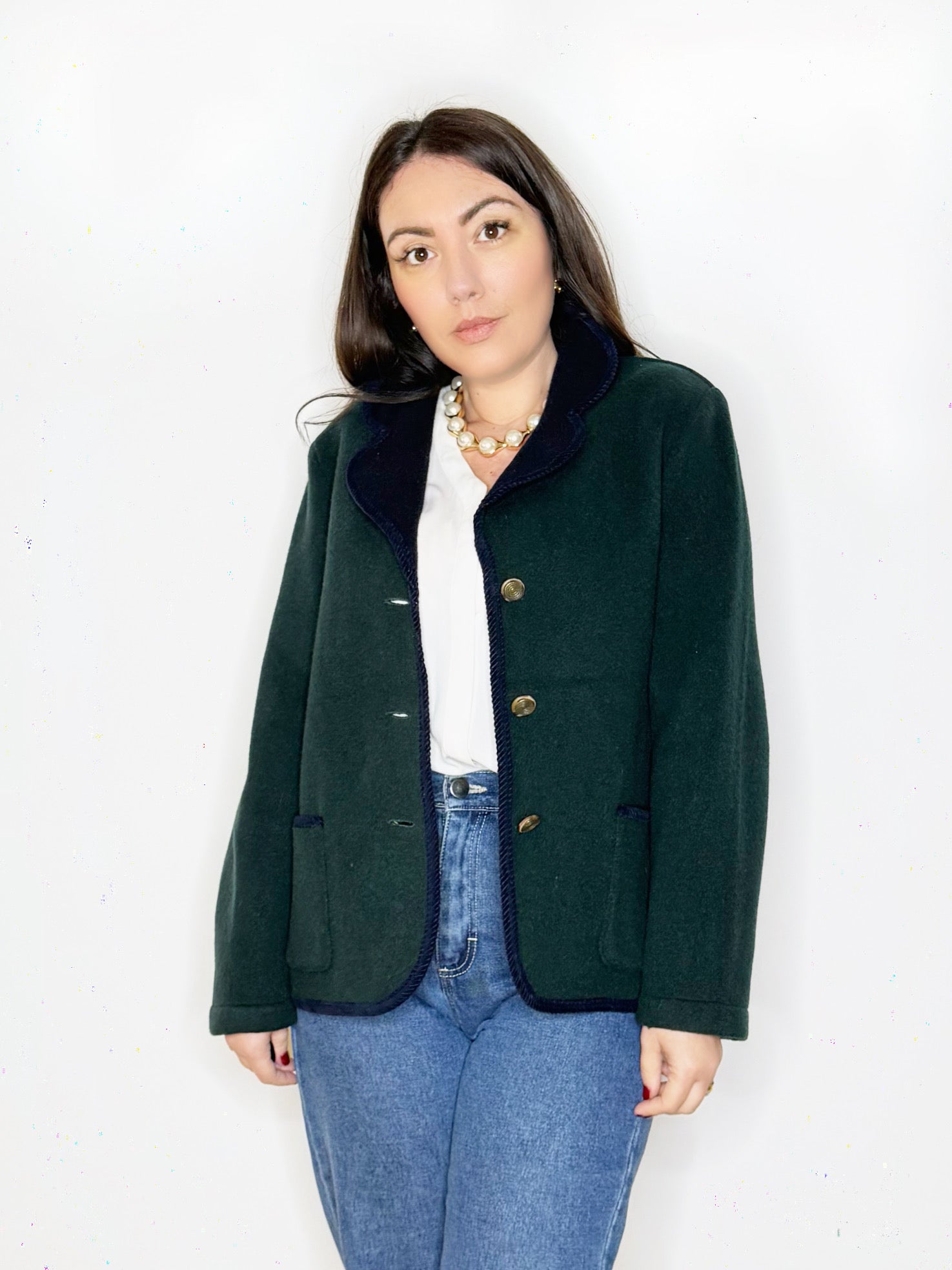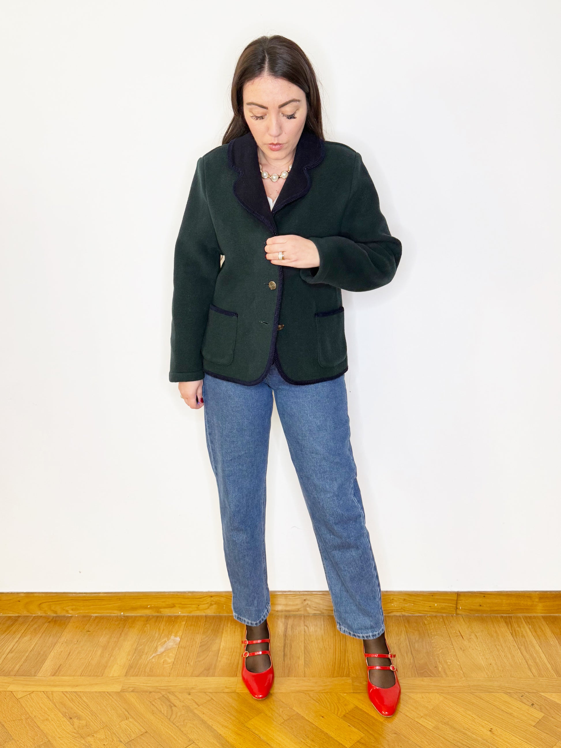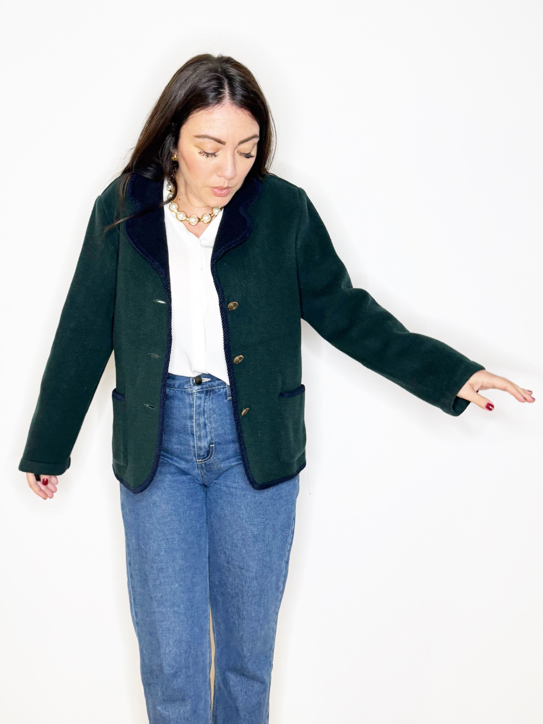 Giacca in lana verde bosco con dettagli blu notte, rever classico, passamaneria ed abbottonatura centrale con bottoni gioiello. Tasche sul davanti. Perfetta da indossare con un jeans dritto oppure con un pantalone sartoriale.