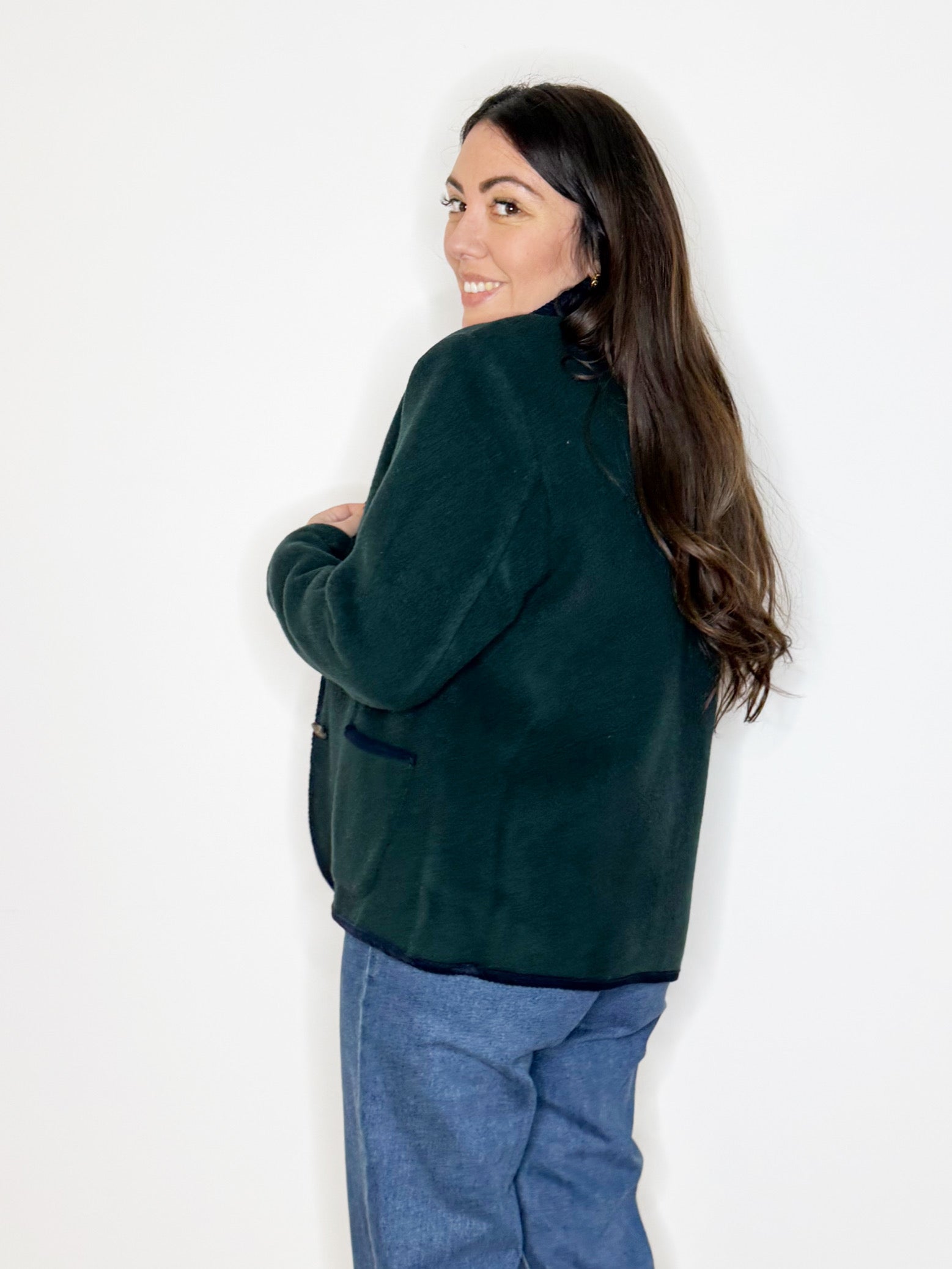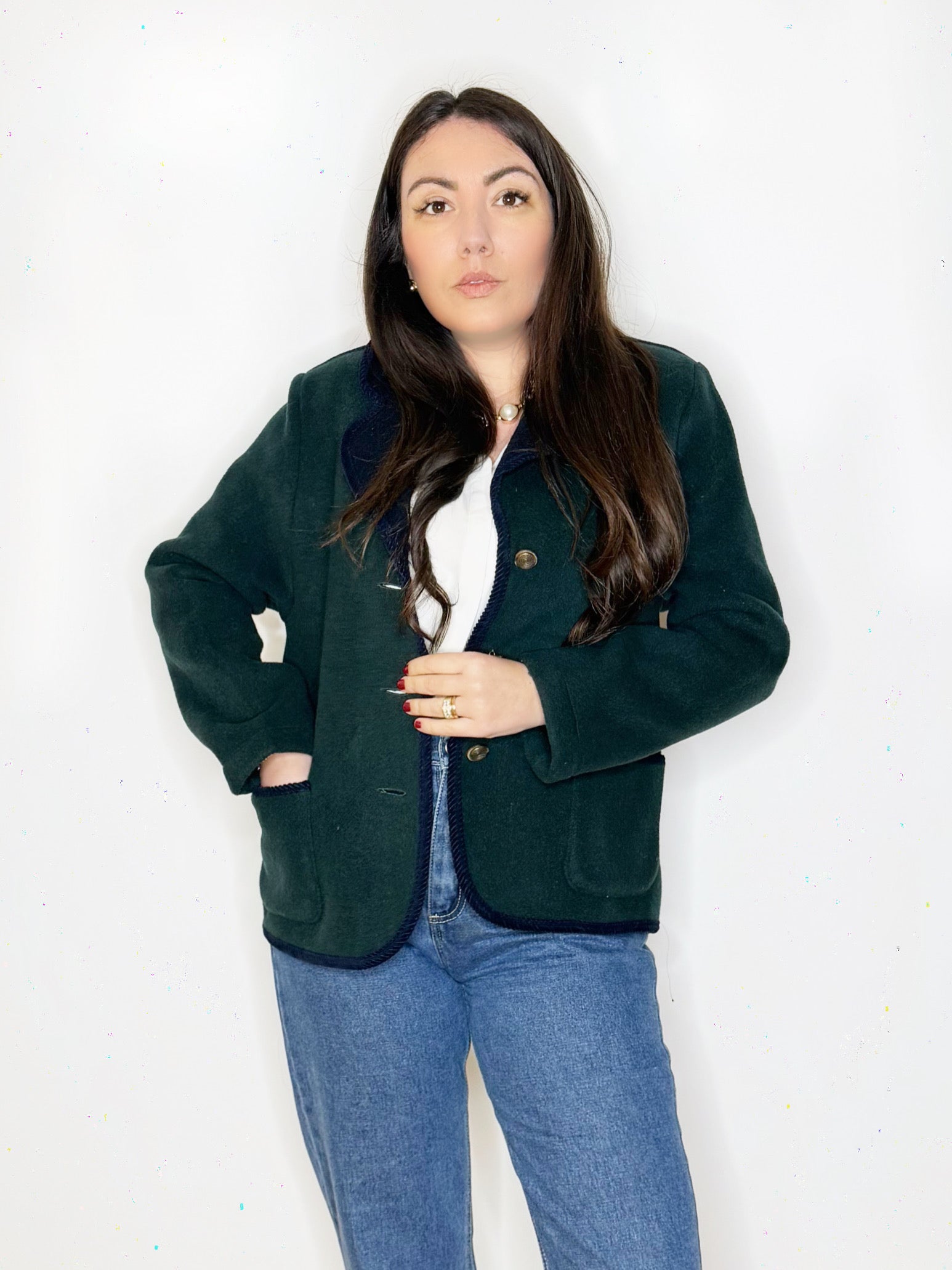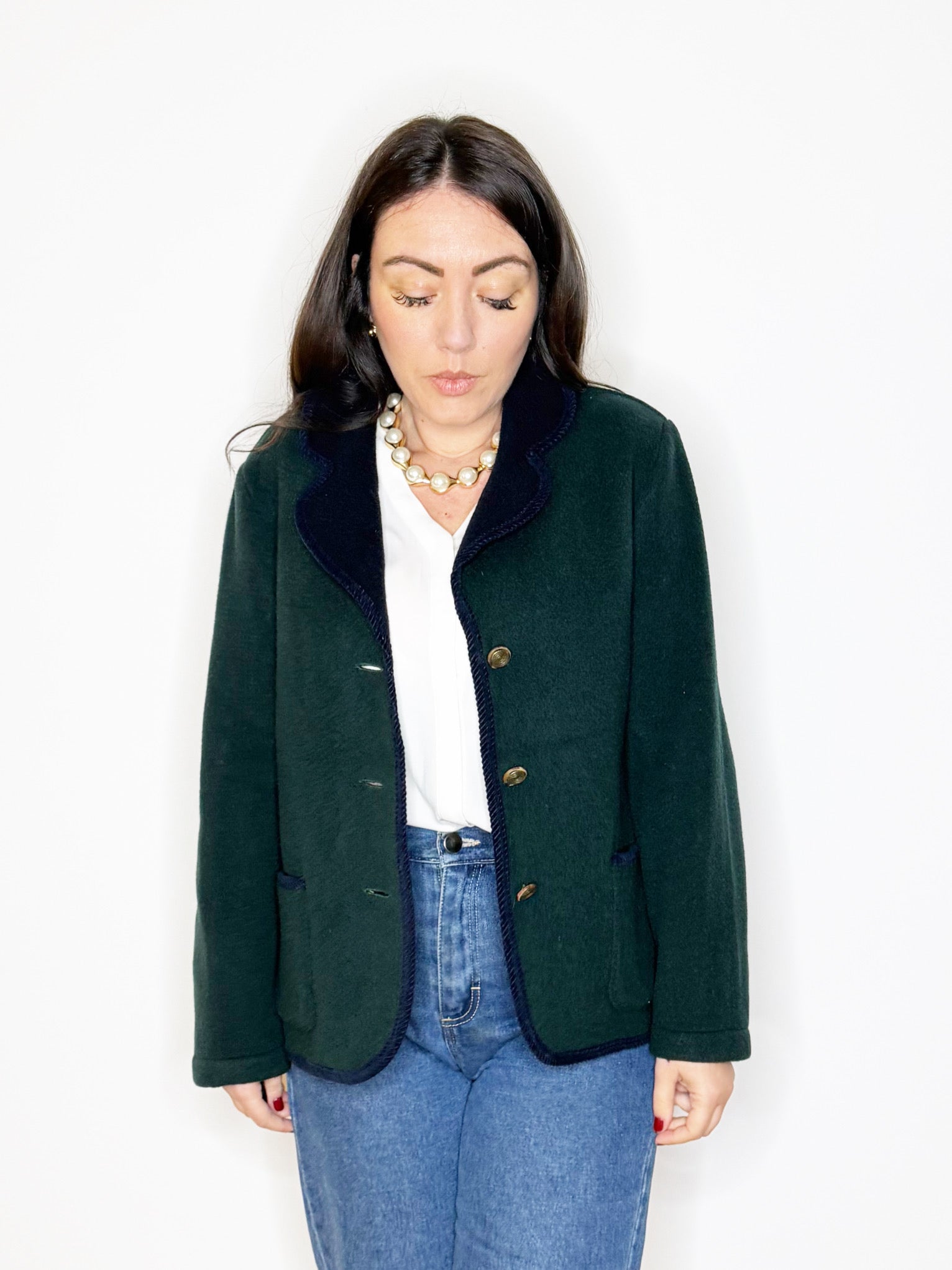 Giacca in lana verde bosco con dettagli blu notte, rever classico, passamaneria ed abbottonatura centrale con bottoni gioiello. Tasche sul davanti. Perfetta da indossare con un jeans dritto oppure con un pantalone sartoriale.
