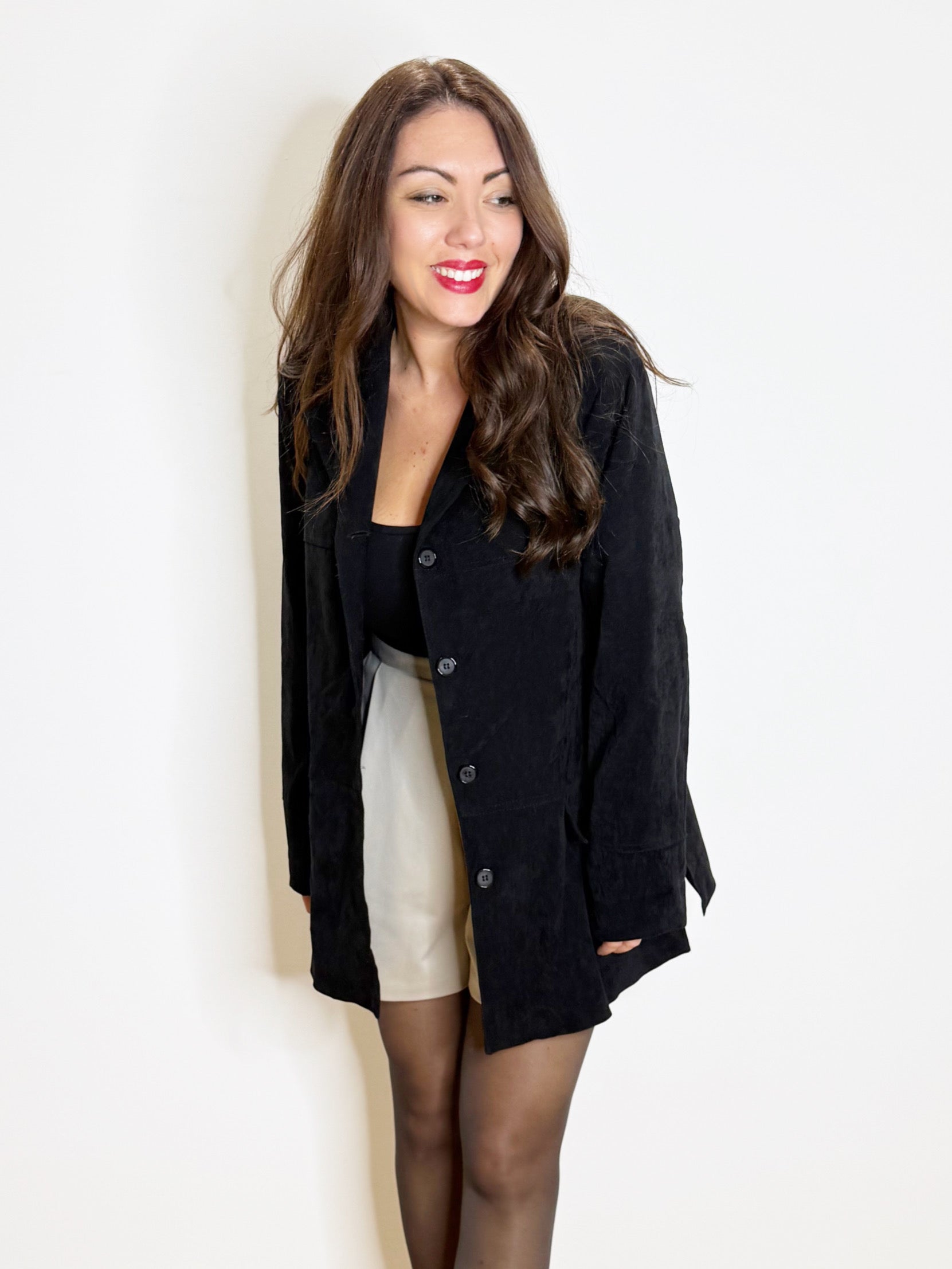 Giacca vintage modello scivolato realizzata in simil suede. Il modello presenta degli spacchi laterali e un’abbottonatura centrale. Modello perfetto per essere indossato con qualsiasi look.