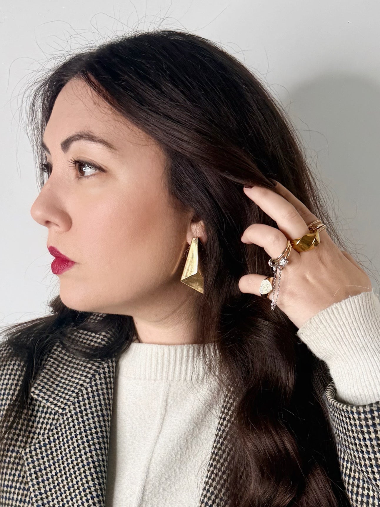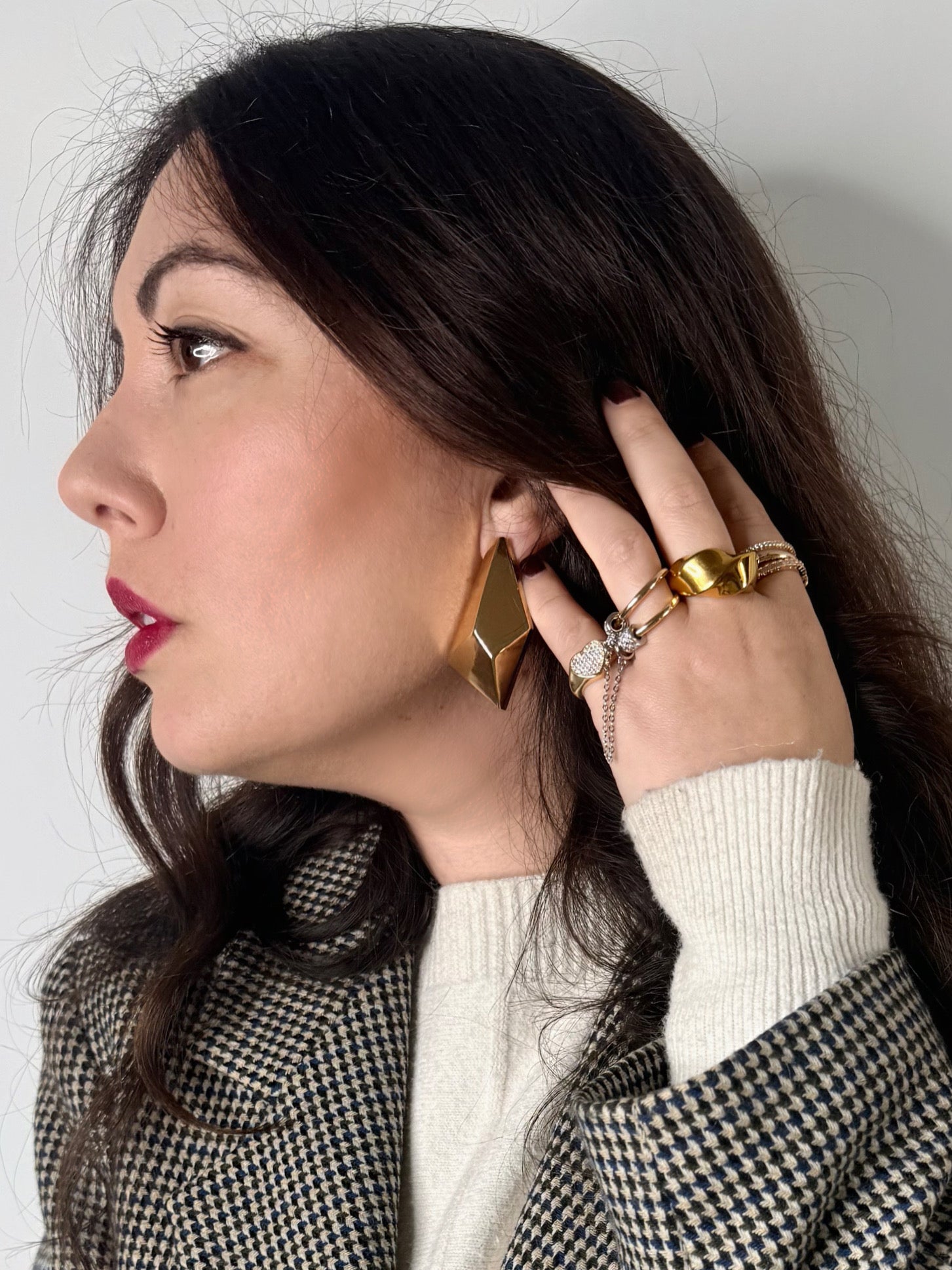 • Asimmetria visiva: La forma è allungata e romboide, pensata per seguire la linea del viso o del lobo, conferendo un tocco futuristico e sofisticato.