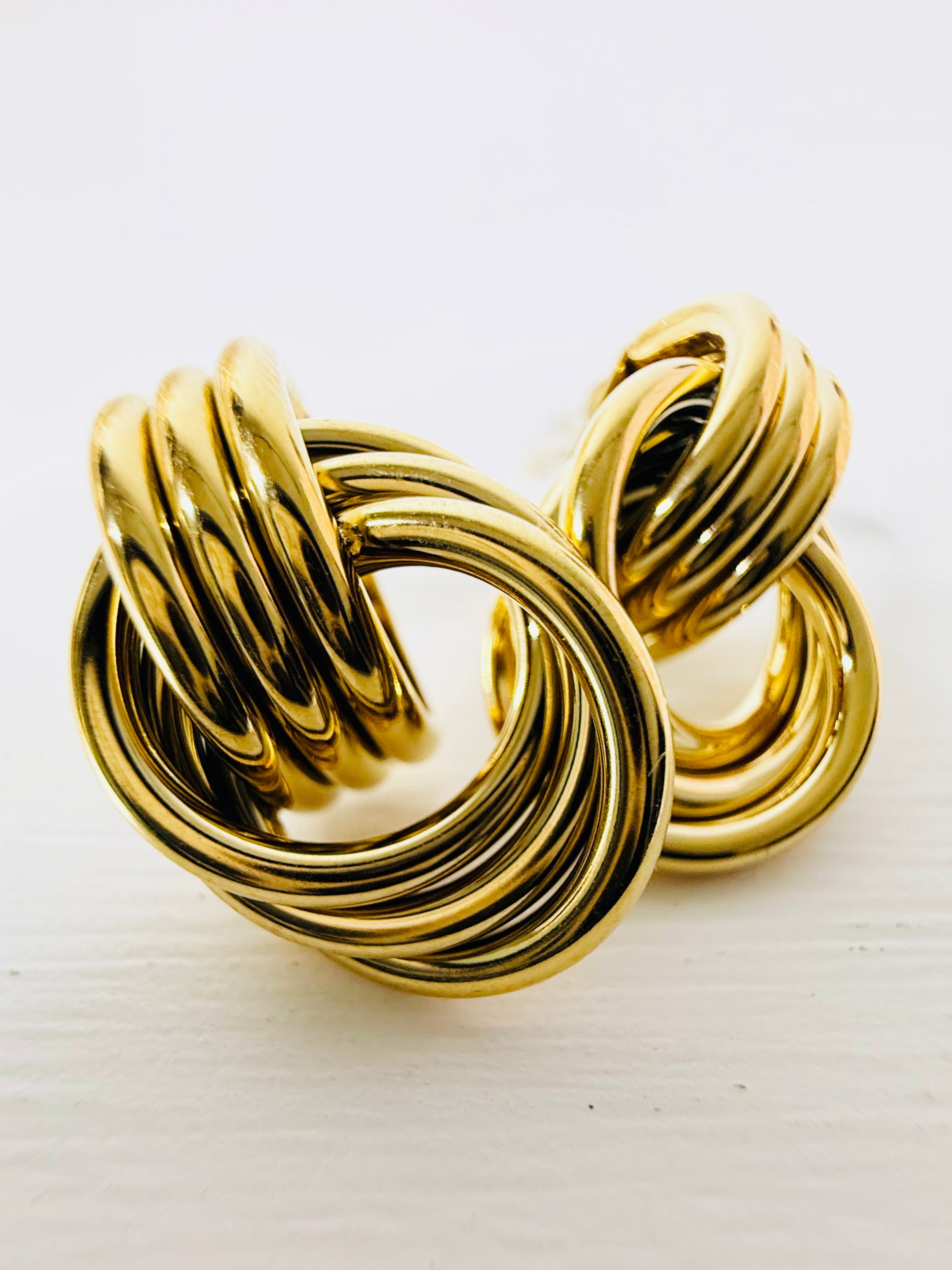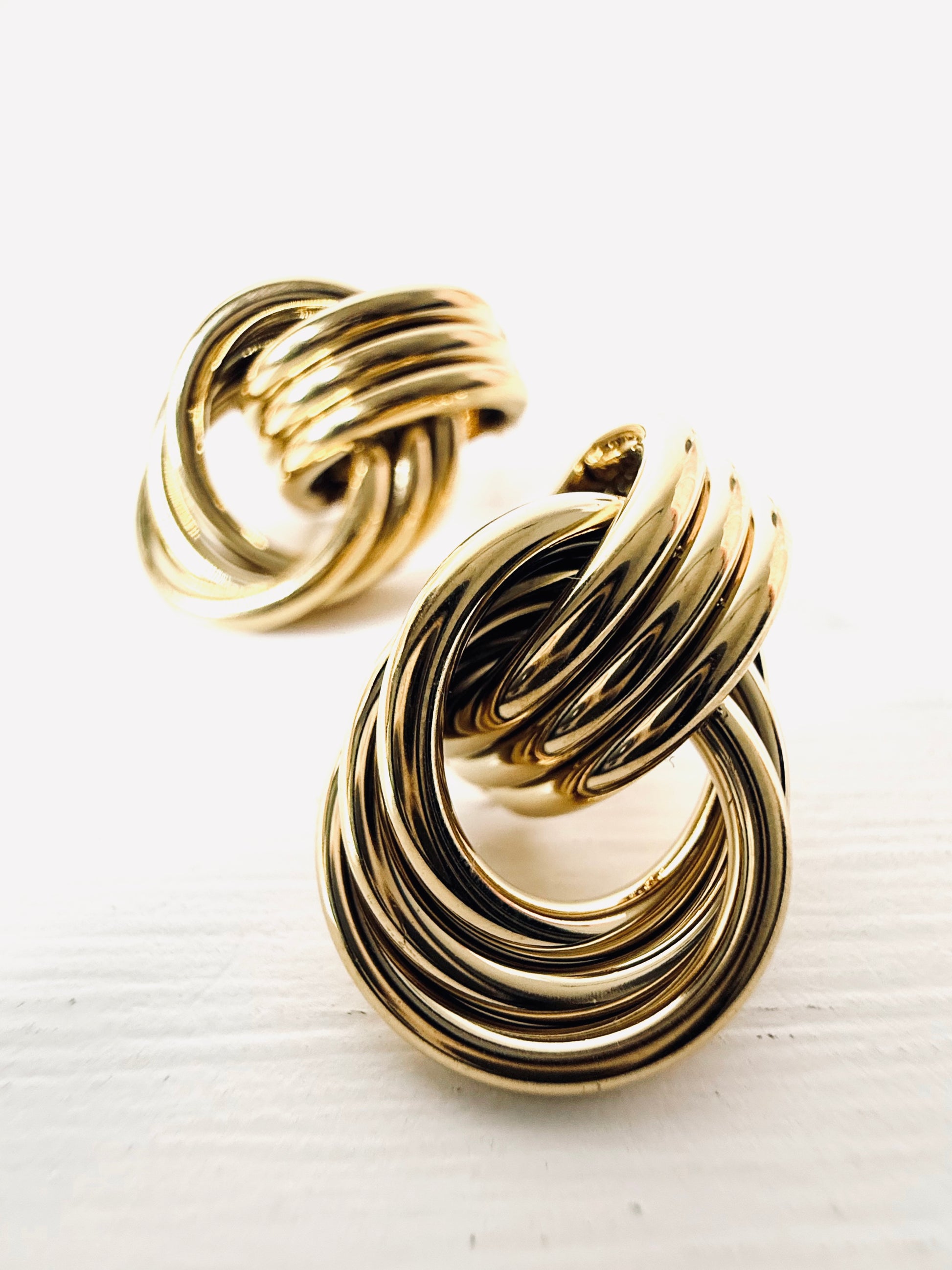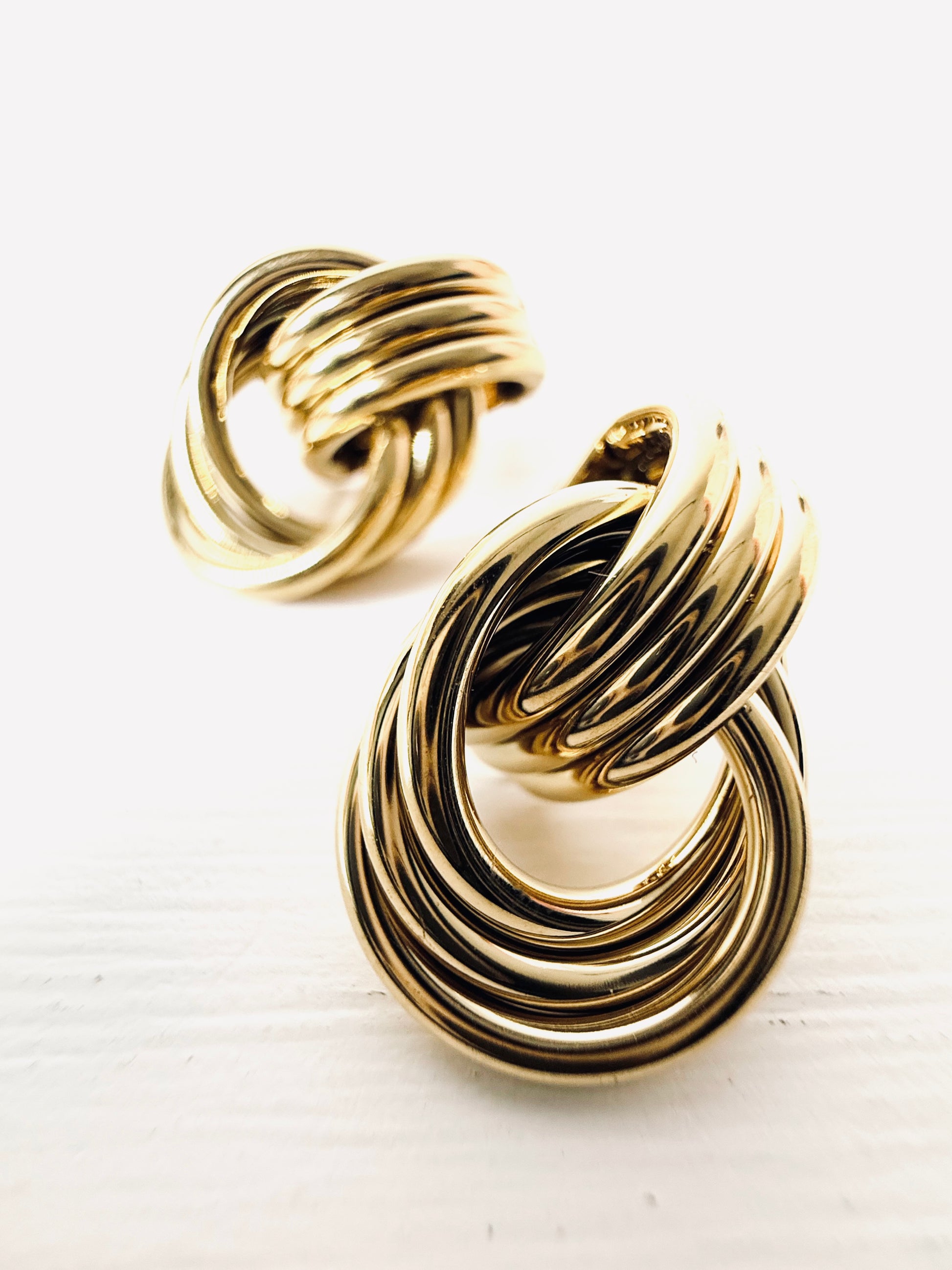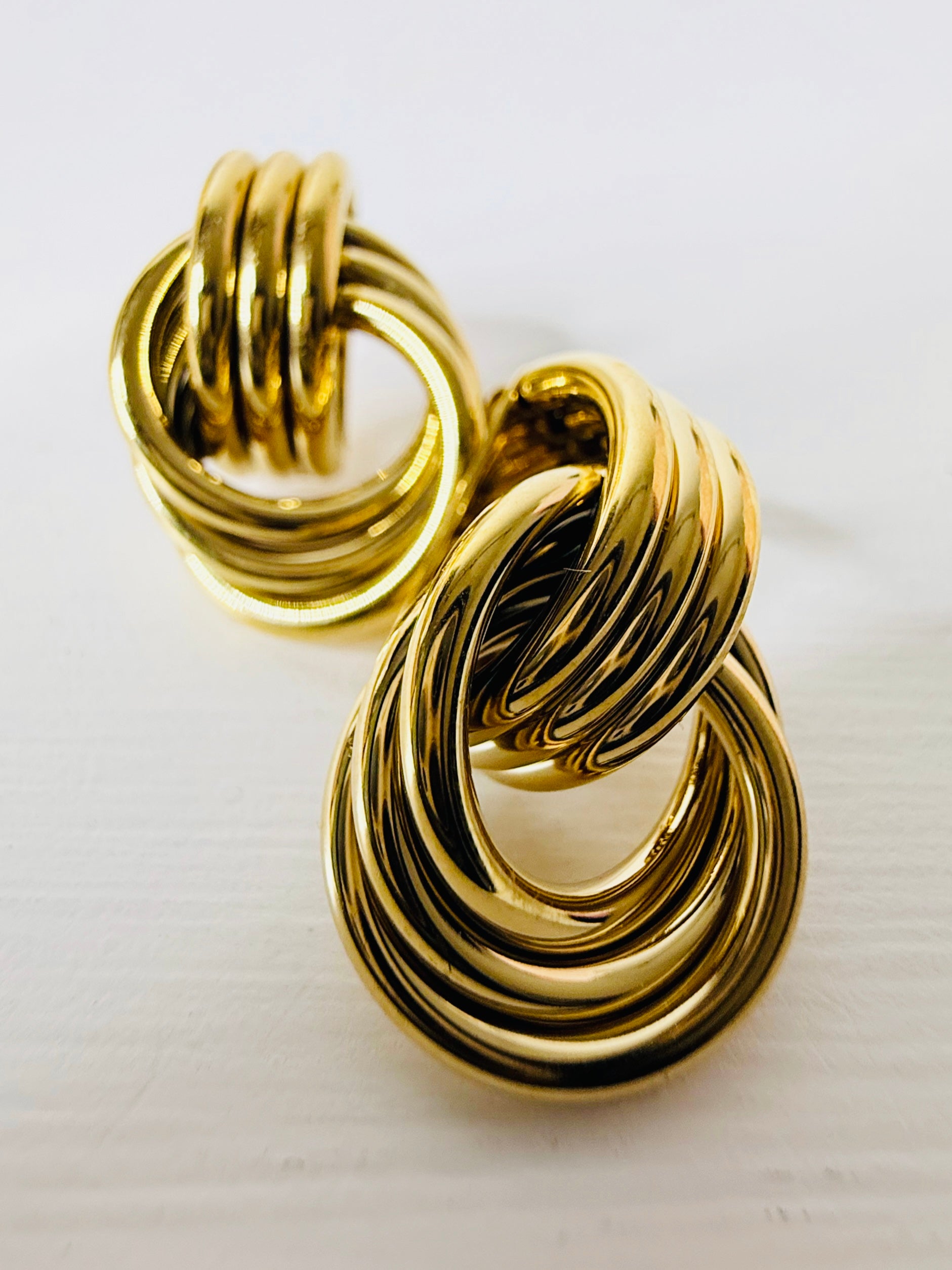 Eleganti orecchini dal design senza tempo realizzati con fasce di nodi. Chiusura a farfallina.
