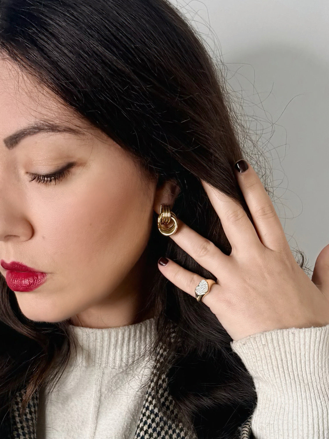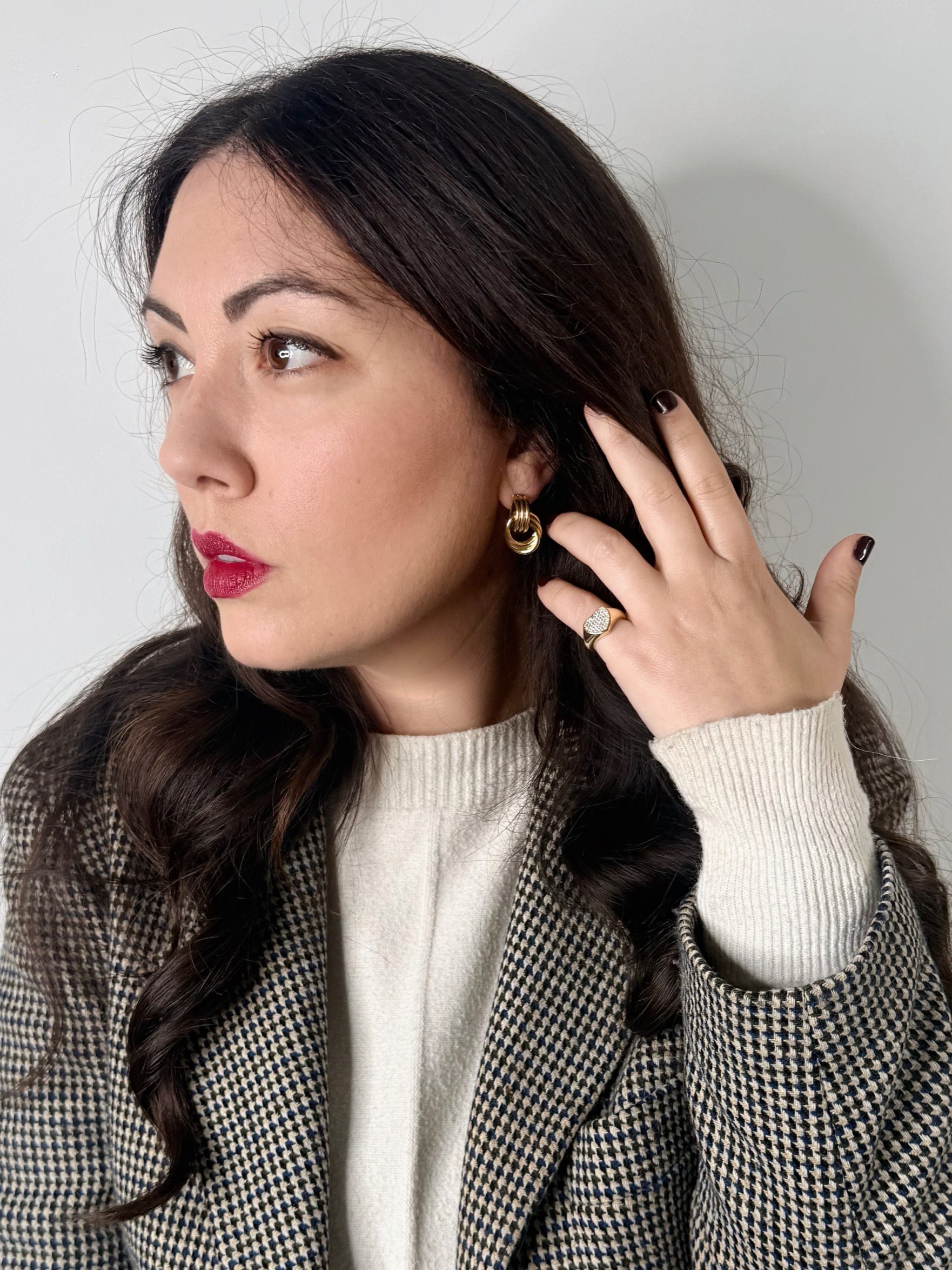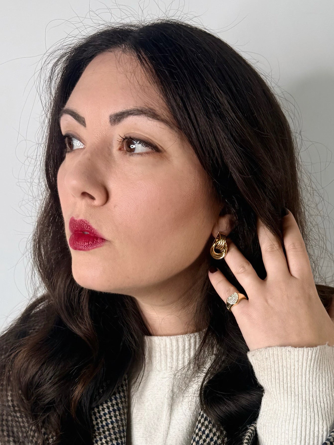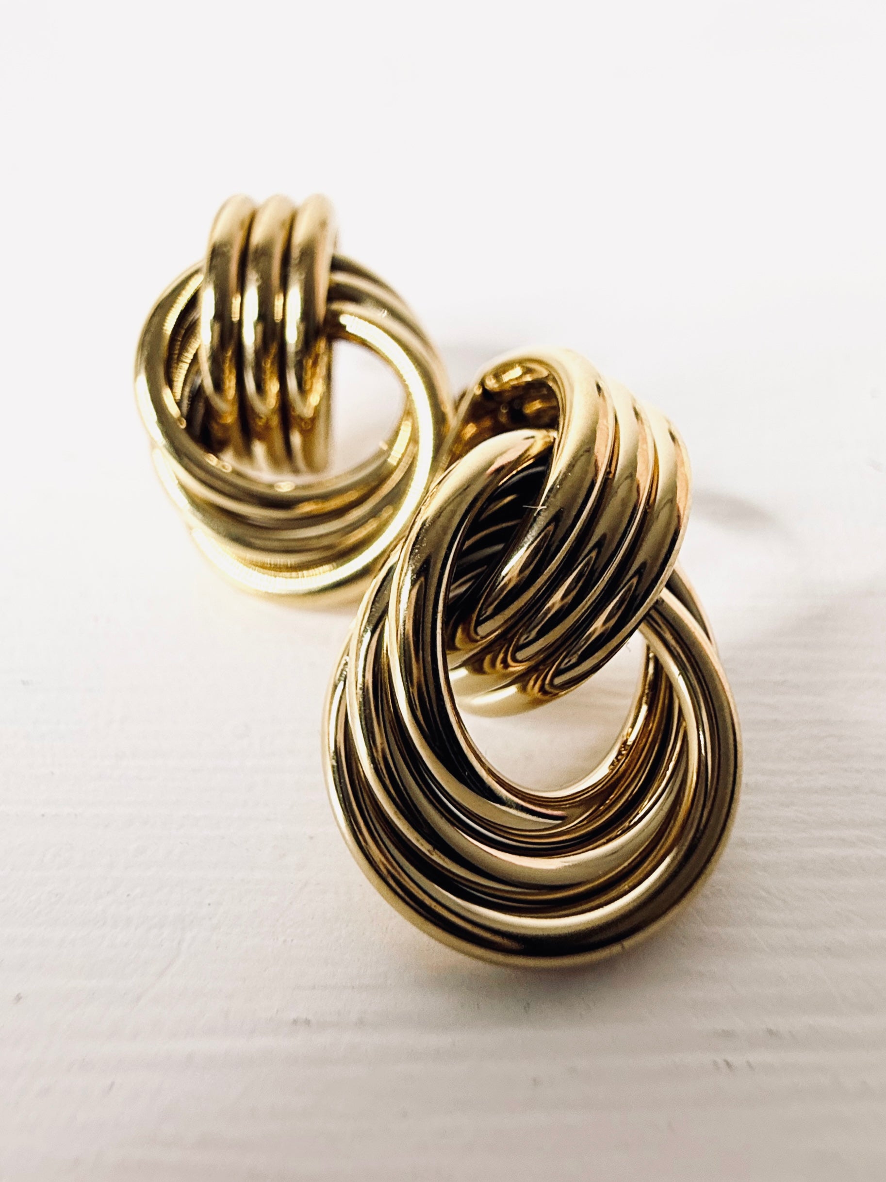 Eleganti orecchini dal design senza tempo realizzati con fasce di nodi. Chiusura a farfallina.