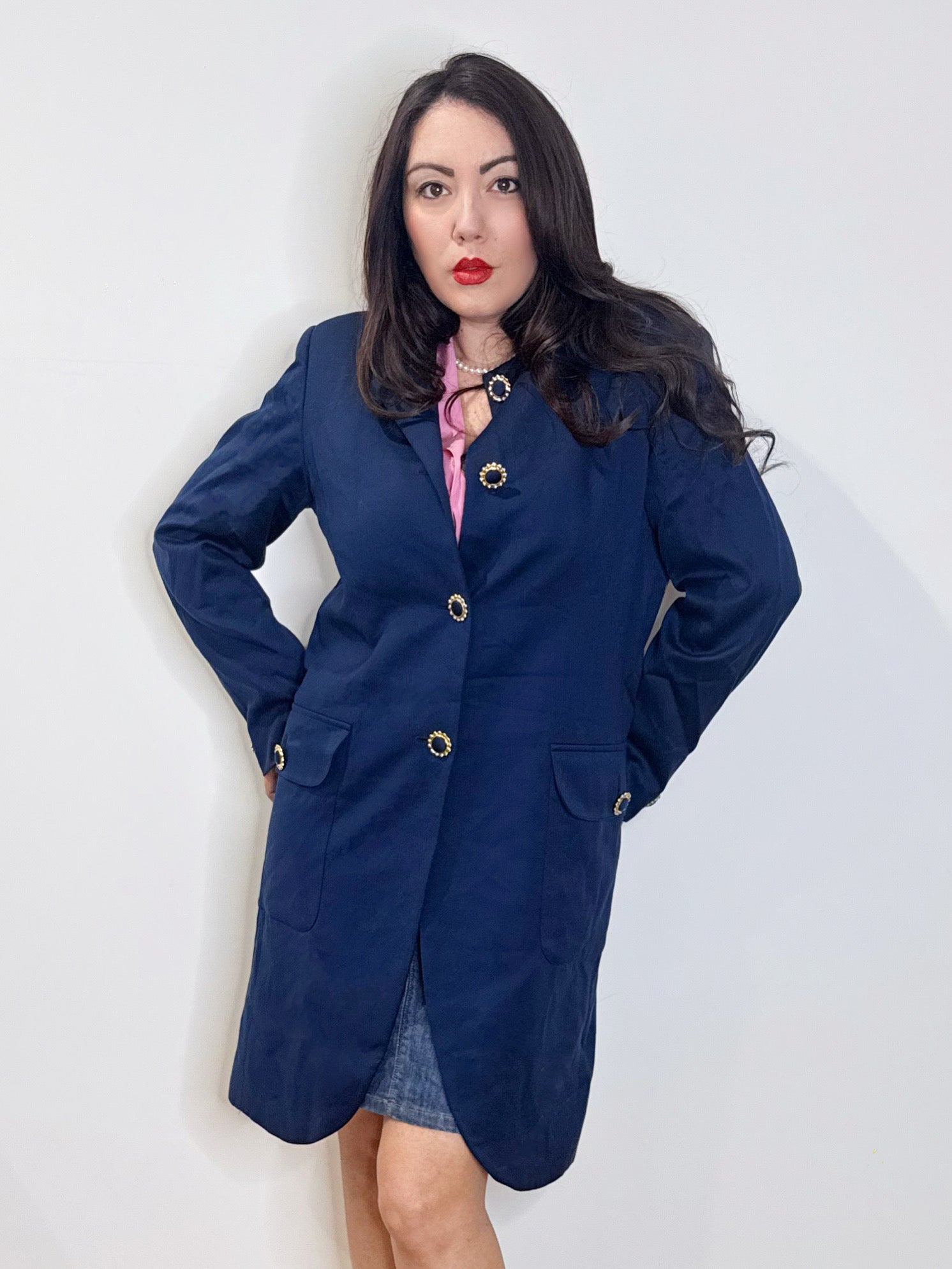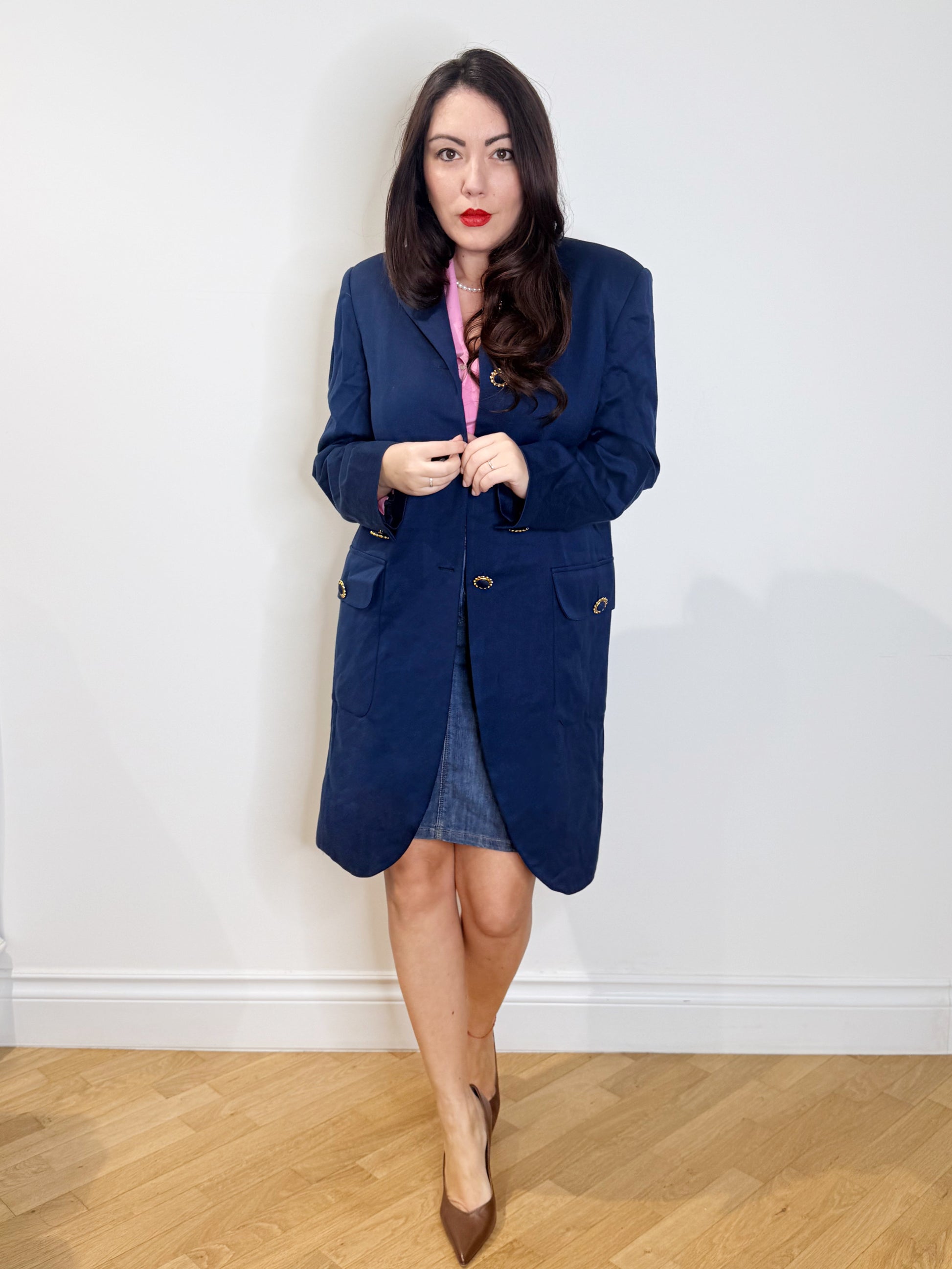 Spolverini vintage in fresco lana blu che porta con sé l’eleganza essenziale e sicura degli anni ’80. Il taglio è dritto, pulito, pensato per scivolare sul corpo con naturalezza e creare una silhouette allungata e armoniosa. Non stringe, non costringe: accompagna. Ha quella presenza discreta ma autorevole che appartiene ai capi nati per durare.