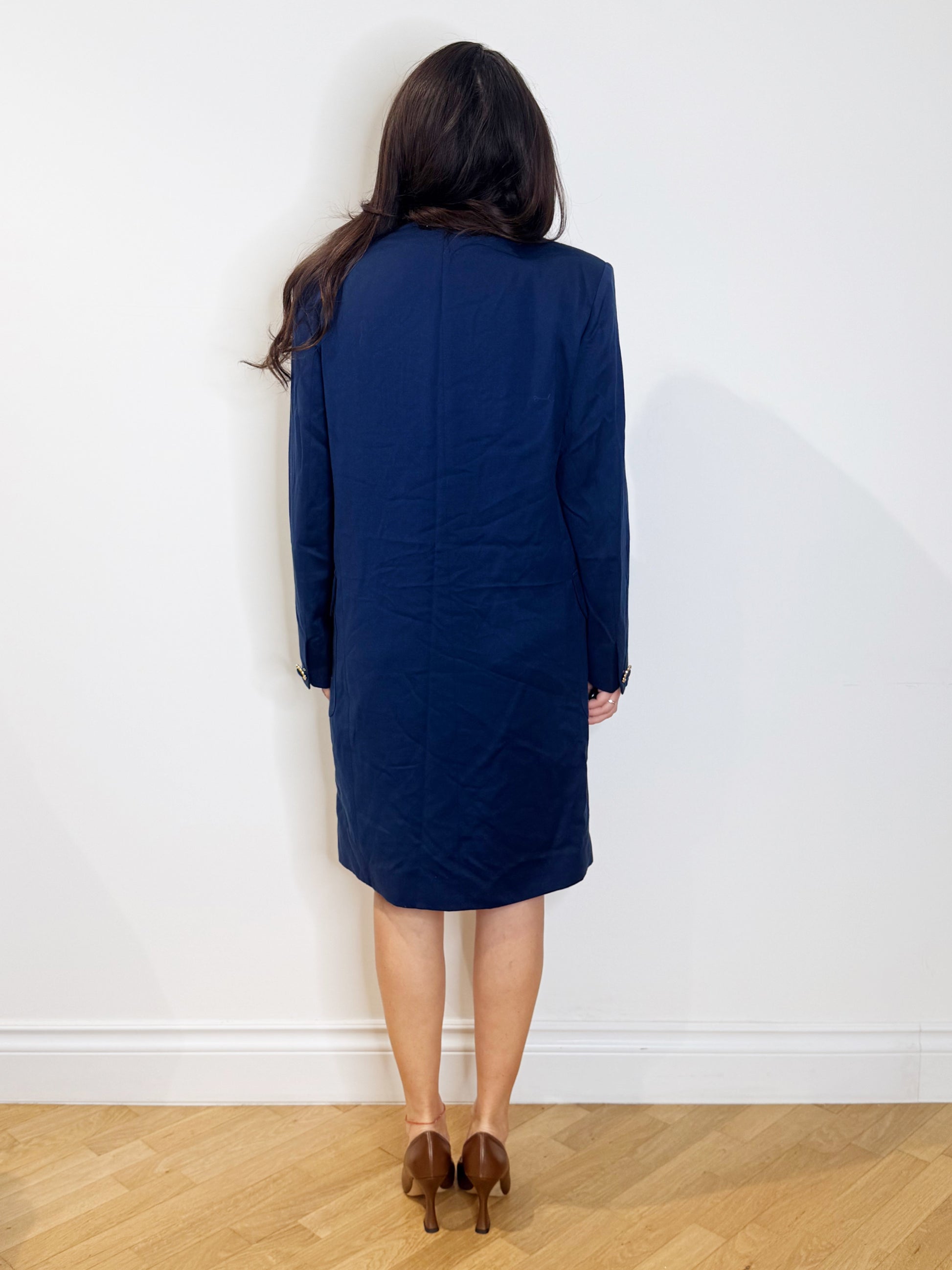Il fresco lana ha una mano leggera e compatta, perfetta per le mezze stagioni. Il tessuto si muove con grazia, seguendo i gesti con una fluidità quasi silenziosa, mentre il blu — profondo e sofisticato — restituisce riflessi diversi a seconda della luce, passando da tonalità più intense a sfumature più morbide e vellutate.